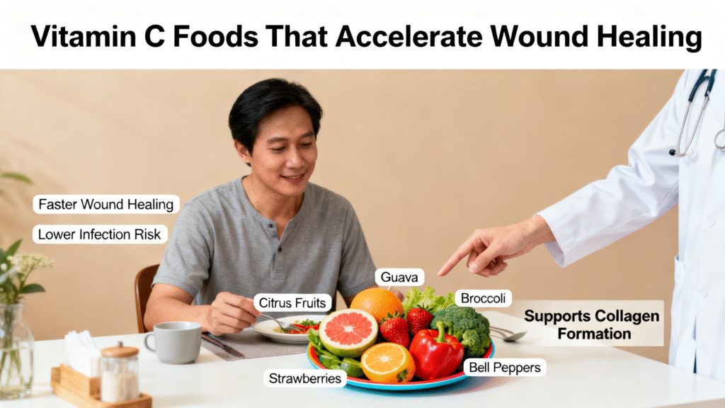 Citrus fruits, guava, strawberries, bell peppers, and broccoli act like natural wound repair boosters. Regular intake supports faster scar formation and lowers infection risk.