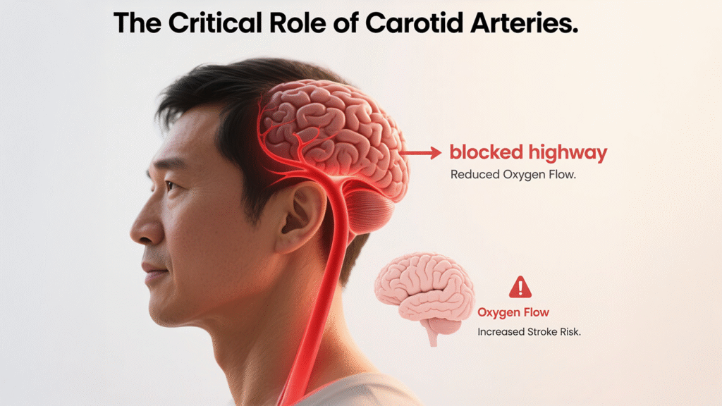 Carotid arteries are like major highways that deliver blood to your brain. When these highways get blocked, even partially, the flow of life-sustaining oxygen is reduced. Reduced blood flow in your carotid arteries increases the risk of a stroke, which can have devastating consequences if not addressed promptly.