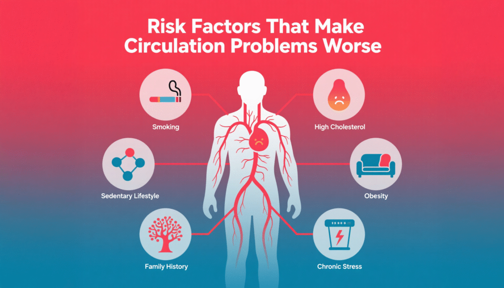 These factors damage arteries and reduce heart efficiency, magnifying circulation problems.